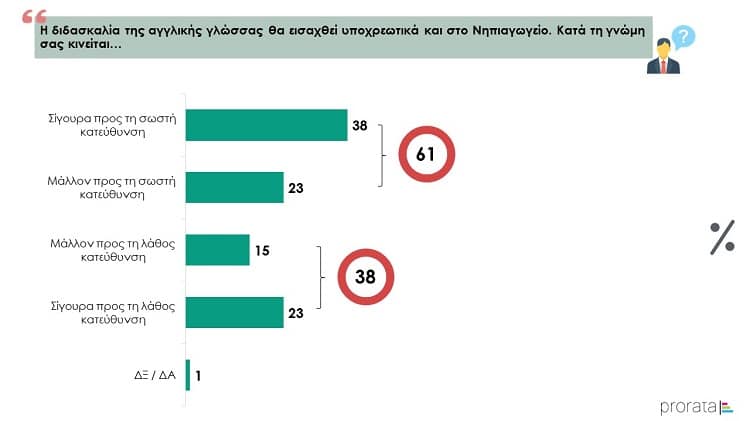 Το 61% των πολιτών πιστεύει ότι η εισαγωγή της αγγλικής γλώσσας στο πρόγραμμα διδασκαλίας των νηπιαγωγείων είναι μια αλλαγή που σίγουρα ή μάλλον κινείται προς τη σωστή κατεύθυνση, ενώ το 38% αυτών πιστεύει ότι σίγουρα ή μάλλον κινείται προς τη λάθος κατεύθυνση. Οι μόνοι οι οποίοι εκτιμούν ότι η διδασκαλία της αγγλικής γλώσσας στα νηπιαγωγεία είναι μια αλλαγή που κινείται προς τη λάθος κατεύθυνση είναι όσοι τοποθετούνται στα αριστερά του πολιτικού φάσματος.