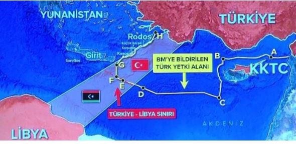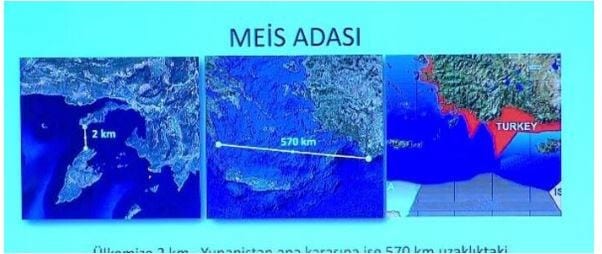 Στη συνέχεια, ο Τούρκος ΥΠΕΞ δείχνει και πάλι τους γνωστούς χάρτες με τη λεγόμενη «τουρκική υφαλοκρηπίδα», η οποία εκτείνεται από τα Κατεχόμενα της Κύπρου μέχρι την Κρήτη και τη Ρόδο, κι εξηγεί ότι τα ελληνικά νησιά πήραν αυτό που τους αναλογεί από το διεθνές δίκαιο, δηλ. μόνο 6 ν.μ. χωρικά ύδατα. Όπως ανέφερε «αν προσέξετε, κοιτάξτε αυτή τη γραμμή, ακριβώς δίπλα στα ελληνικά νησιά, εμείς σε αυτά τα νησιά δώσαμε 6 ναυτικά μίλια χωρικών υδάτων. Τα νησιά έχουν χωρικά ύδατα, αλλά όχι υφαλοκρηπίδα. Όπως λέει και το διεθνές δίκαιο. Η Ελλάδα παλαιότερα ήθελε να τα επεκτείνει στα 12 (ν.μ.), όπως ξέρετε, προσπαθούσε να αποδείξει ότι αποτελούν κι αυτά ηπειρωτική χώρα. Δεν το έκανε βασικά μόνο με εμάς, το ίδιο προσπάθησε να κάνει και με τη Λιβύη και την Αίγυπτο. Ο λόγος που δεν έχει συμφωνήσει με την Αίγυπτο είναι αυτός». Ο Μεβλούτ Τσαβούσογλου εξήγησε στη συνέχεια τη συμφωνία που υπέγραψε η Ελλάδα με την Ιταλία στο Ιόνιο για να επαναλάβει ότι ούτε η Ελλάδα αναγνώρισε υφαλοκρηπίδα στα νησιά του Ιονίου, μια θέση που επικροτεί ουσιαστικά τη θέση της Άγκυρας, όπως είπε.