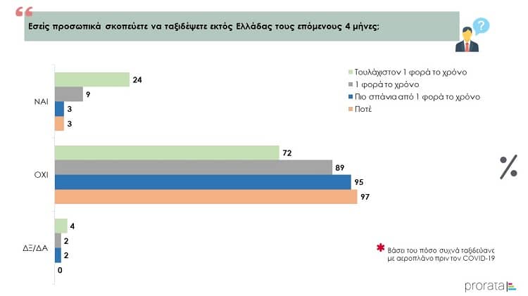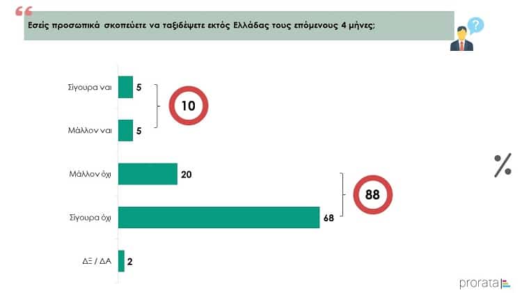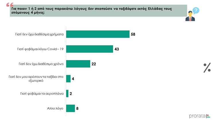 - 1 στους 10 συμμετέχοντες μάλλον ή σίγουρα σκοπεύει να ταξιδέψει εκτός Ελλάδας τους επόμενους τέσσερις μήνες. Μεταξύ όσων απάντησαν ότι δεν προτίθενται να ταξιδέψουν στο εξωτερικό «η έλλειψη χρημάτων και «ο φόβος σε σχέση με τον Covid – 19» εμφανίζονται ως κύριες αιτίες της συγκεκριμένης στάσης, ενώ δευτερευόντως «η έλλειψη διαθέσιμου χρόνου».
