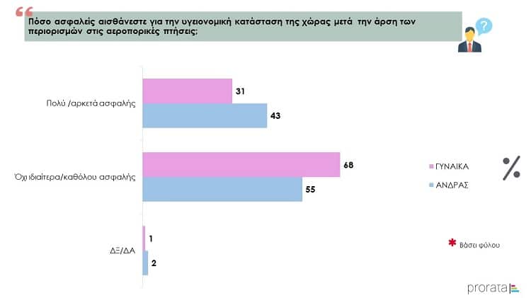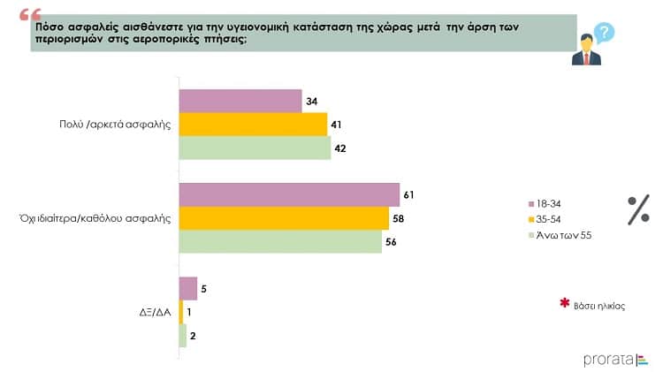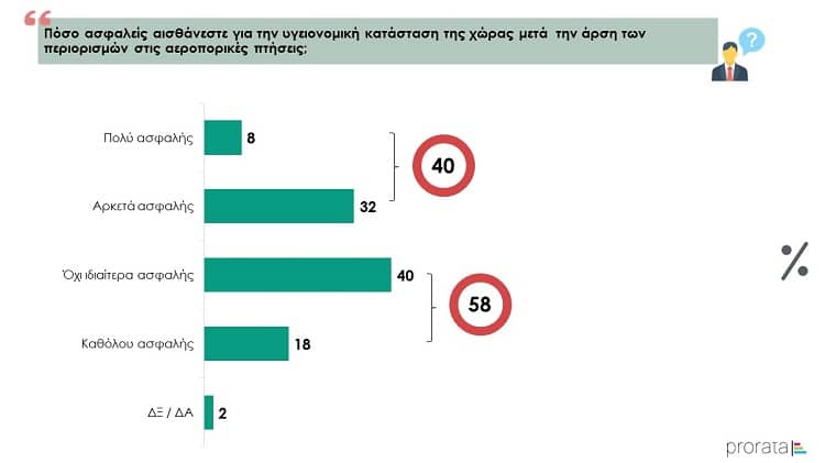 - Η μειοψηφία των συμμετεχόντων (40%) νιώθουν αρκετά ή πολύ ασφαλείς σε σχέση με την υγειονομική κατάσταση της χώρας μετά την άρση των περιορισμών στις αεροπορικές πτήσεις, ενώ η πλειοψηφία αυτών (58%) νιώθουν καθόλου ή όχι ιδιαίτερα ασφαλείς.