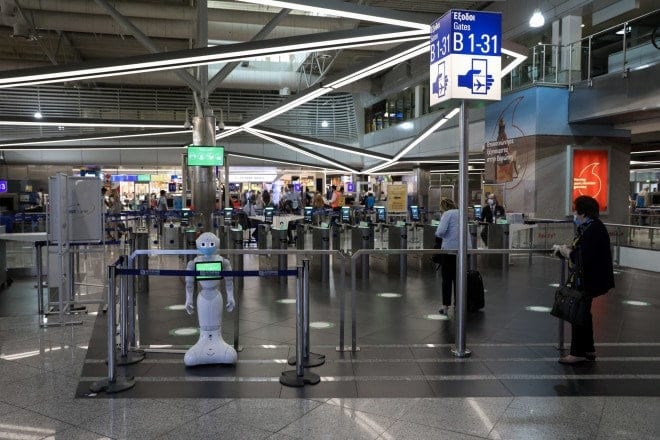 Τα εν λόγω ρομπότ μιλούν πολλές γλώσσες, δίνουν συμβουλές, αλλά αρνούνται να κάνουν αγκαλιές.«Προτεραιότητα μας η υγεία σας» λένε τα «δίδυμα» ρομπότ, οι Peppers, που έχουν τοποθετηθεί στην αίθουσα αναχωρήσεων και δίνουν ένα ξεχωριστό τόνο στους ανήσυχους επιβάτες. Άλλοι βγάζουν φωτογραφίες και άλλοι τα βιντεοσκοπούν.