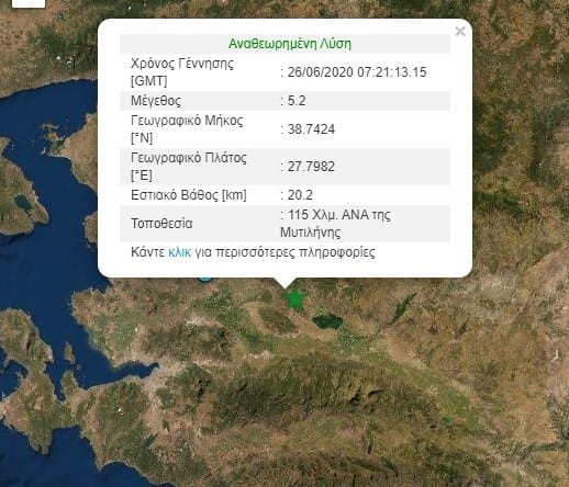 Το επίκεντρο τοποθετείται 115 χλμ. νοτιοανατολικά της Μυτιλήνης. Η δόνηση έγινε αισθητή σε αρκετά ελληνικά νησιά.