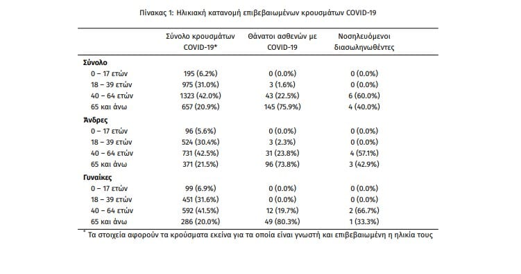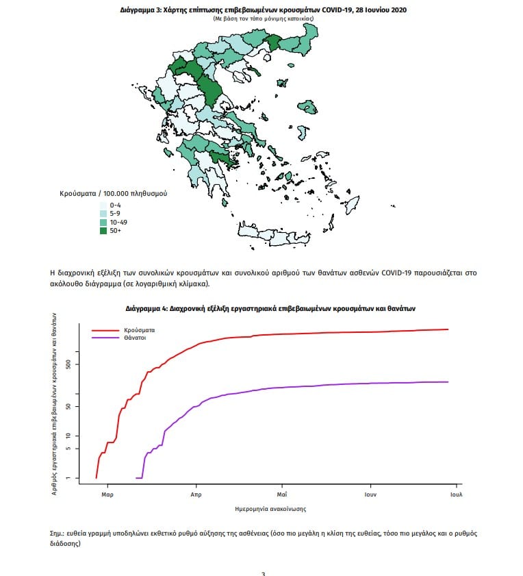 Ο συνολικός αριθμός των κρουσμάτων είναι 3376, εκ των οποίων το 54.9% αφορά άνδρες. 754 (22.3%) θεωρούνται σχετιζόμενα με ταξίδι από το εξωτερικό και 1880 (55.7%) είναι σχετιζόμενα με ήδη γνωστό κρούσμα. Δέκα άνθρωποι νοσηλεύονται διασωληνωμένοι. Η διάμεση ηλικία τους είναι 60 ετών. 3 (30.0%) είναι γυναίκες και οι υπόλοιποι άνδρες. To 90.0% έχει υποκείμενο νόσημα ή είναι ηλικιωμένοι 70 ετών και άνω. 119 ασθενείς έχουν εξέλθει από τις ΜΕΘ. Τέλος, δεν έχει καταγραφεί κανένας νέος θάνατος ενώ έχουμε 191 θανάτους συνολικά στη χώρα. 61 (31.9%) γυναίκες και οι υπόλοιποι άνδρες. Η διάμεση ηλικία των θανόντων συμπολιτών, σύμφωνα με την ανακοίνωση του ΕΟΔΥ, ήταν τα 76 έτη και το 95.8% είχε κάποιο υποκείμενο νόσημα ή/και ηλικία 70 ετών και άνω.