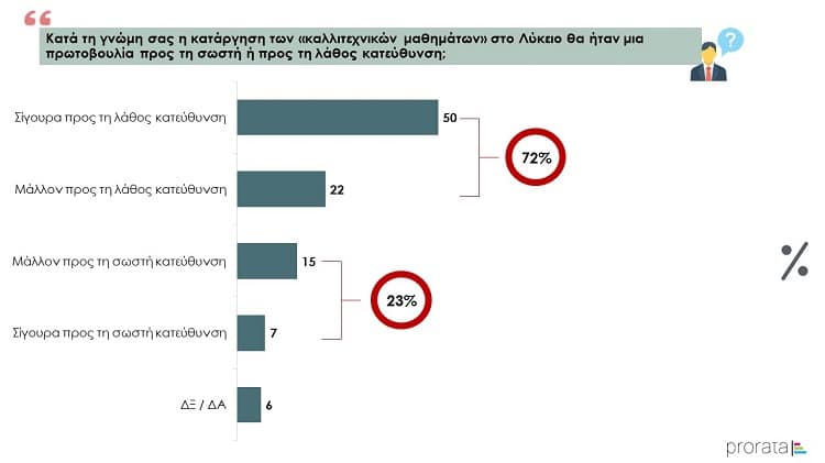 • Στην ερώτηση «Κατά τη γνώμη σας η κατάργηση των «καλλιτεχνικών μαθημάτων» στο Λύκειο θα ήταν μια πρωτοβουλία προς τη σωστή ή προς τη λάθος κατεύθυνση;», το 72% των ερωτηθέντων απάντησαν σίγουρα/μάλλον προς τη λάθος κατεύθυνση ενώ το 23% απάντησε σίγουρα/μάλλον προσ τη σωστή κατεύθυνση.
