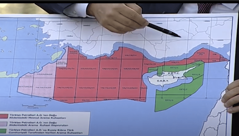 «Χρησιμοποιούμε συχνά αυτό το χάρτη, γιατί η περιοχή στην οποία αναφερόμαστε είναι μια πολύ ευρεία περιοχή, αν κοιτάξετε. Όπως είναι ο νέος όρος, θα μπορούσαμε να πούμε ότι αυτά είναι τα σύνορα της «Γαλάζιας Πατρίδας» μας. Αυτός είναι ο χάρτης των ζωνών θαλάσσιας δικαιοδοσίας μας, της οικονομικής μας ζώνης. Η περιοχή με κόκκινο είναι η Αποκλειστική Οικονομική Ζώνη της Τουρκικής Δημοκρατίας με βάση την υφαλοκρηπίδα της. Η περιοχή με πράσινο είναι η περιοχή, για την οποία η ΤΔΒΚ έχει παράσχει άδεια στην ΤΡΑΟ (Τουρκική Εταιρία Πετρελαίων) για έρευνες και εξορύξεις πετρελαίου.