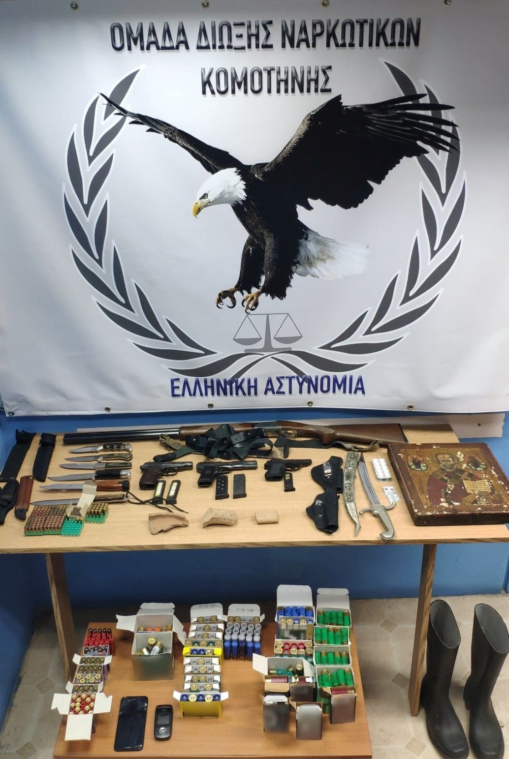 Κατασχέθηκαν 6 φυτά κάνναβης, 3 πιστόλια, 1 κυνηγετικό όπλο, πλήθος φυσιγγίων, 1 σπάθα, 6 μαχαίρια, 3 τεμάχια αμφορέων και 1 εκκλησιαστική εικόνα