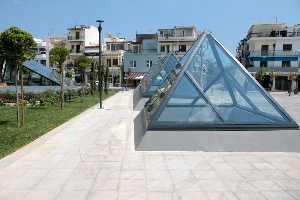 Στην πλατεία διαμορφώνονται τρεις φεγγίτες με υαλοπετάσματα χωροθετημένοι εν σειρά, για την παροχή φυσικού φωτισμού στο εσωτερικό του σταθμού σε χώρους κυκλοφορίας κοινού.