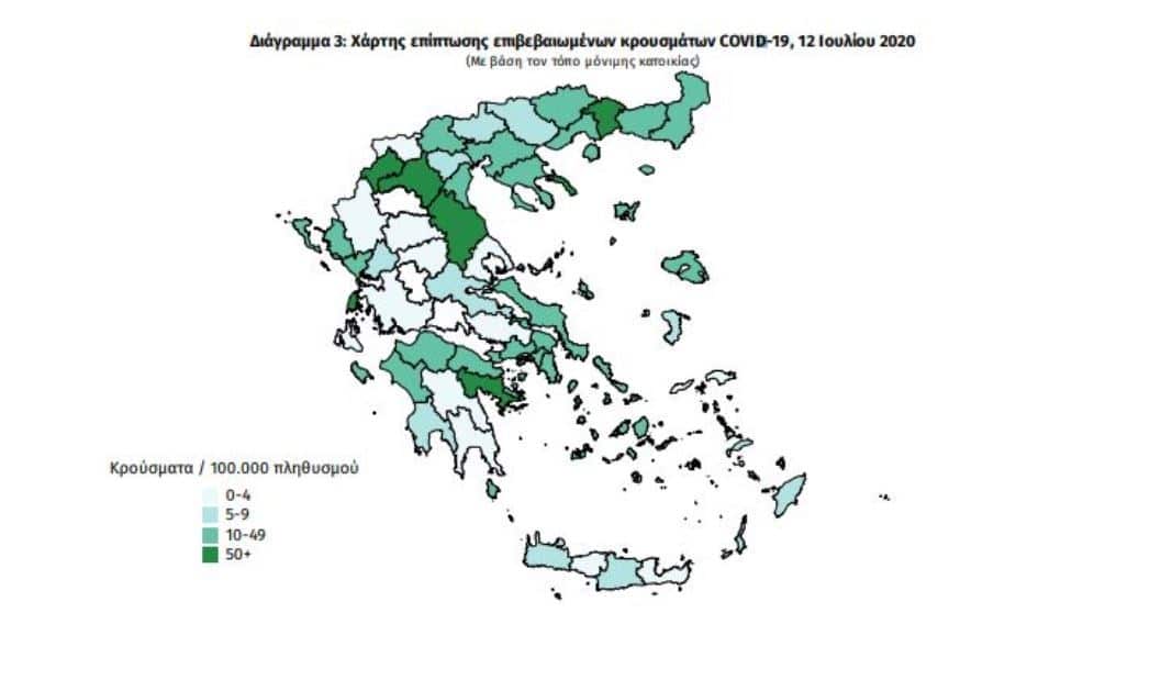 Υπενθυμίζεται, ότι το απόγευμα της Κυριακής ο ΕΟΔΥ ανακοίνωσε ότι επιβεβαιώθηκαν 31 νέα κρούσματα με αποτέλεσμα ο συνολικός αριθμός να έχει ανέλθει σε 3.803. Τα 4 από τα νέα κρούσματα εντοπίστηκαν σε ελέγχους που έγιναν στις πύλες εισόδου της χώρας μας. Όπως φαίνεται στον χάρτη, η Ξάνθη, η Λάρισα, η Κοζάνη, η Καστοριά, η Αργολίδα, το νησί της Λευκάδας και η χερσόνησος του Αθω, έχουν τα περισσότερα συγκεντρωμένα κρούσματα στη διαβάθμιση που ορίζει ο ΕΟΔΥ στις επιδημιολογικές του εκθέσεις (περισσότερα από 50 ανά 100.000 πληθυσμού). Πολλές περιοχές έχουν προστεθεί στη δεύτερη κλίμακα, δηλαδή 10 – 49 κρούσματα ανά 100.000 πληθυσμού. Η συγκεκριμένη, μάλιστα, κλίμακα καλύπτει το μεγαλύτερο μέρος της χώρας μας.