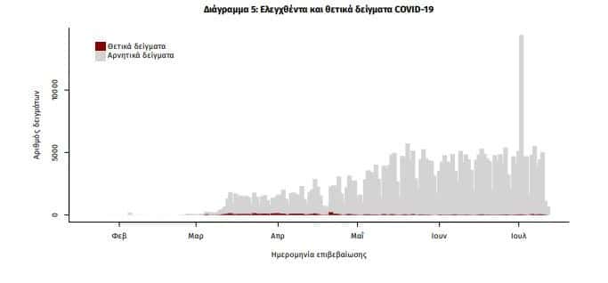 Δείγματα που έχουν ελεγχθεί στα συνεργαζόμενα με τον ΕΟΔΥ εργαστήρια: Από την 1η Ιανουαρίου 2020 μέχρι σήμερα, στα εργαστήρια που διενεργούν ελέγχους για τον νέο κορονοϊό (SARS-CoV-2) και που δηλώνουν συστηματικά στον ΕΟΔΥ το σύνολο των δειγμάτων που ελέγχουν (θετικά και αρνητικά), έχουν συνολικά ελεγχθεί 373932 κλινικά δείγματα, εκ των οποίων τα 5961 (1.6%) ήταν θετικά στον κορονοϊό (συμπεριλαμβάνονται και περισσότερα από ένα δείγματα ανά άτομο που ελέγχθηκε). Από το ανωτέρω σύνολο δειγμάτων, τα 41316 (11.0%) αφορούν δειγματοληψίες σε εισερχόμενες αεροπορικές πτήσεις (από τις 12 Ιουνίου). Εξ’αυτών τα 84 (0.2%) θετικά στον κορονοϊό.