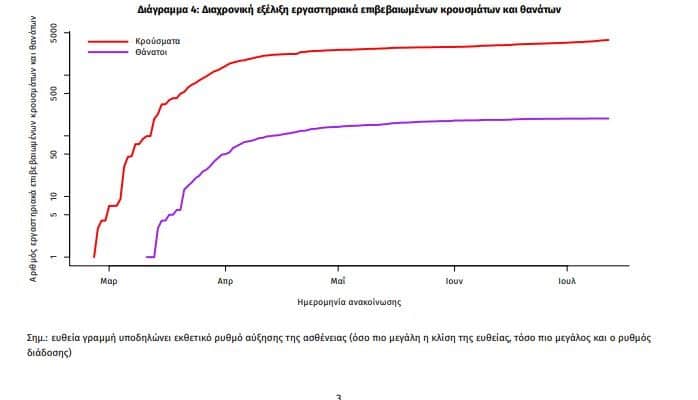 Η διαχρονική εξέλιξη των συνολικών κρουσμάτων και συνολικού αριθμού των θανάτων ασθενών COVID-19 παρουσιάζεται στο ακόλουθο διάγραμμα (σε λογαριθμική κλίμακα).