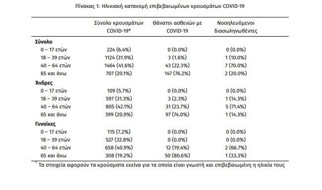 Σύμφωνα με την ανακοίνωση του ΕΟΔΥ, από το σύνολο των 3.803 κρουσμάτων, 998 (26.2%) θεωρούνται σχετιζόμενα με ταξίδι από το εξωτερικό, 1989 (52.3%) είναι σχετιζόμενα με ήδη γνωστό κρούσμα και τα υπόλοιπα δεν σχετίζονται ούτε με ταξίδι ούτε με άλλο γνωστό κρούσμα ή είναι ακόμα υπό διερεύνηση. Η μέση ηλικία των κρουσμάτων είναι 47 έτη (εύρος 0 έως 102 ετών), ενώ η μέση ηλικία των θανάτων είναι 76 έτη (εύρος 35 έως 102 ετών). Η ηλικιακή κατανομή των (α) συνολικών κρουσμάτων, (β) των περιστατικών που κατέληξαν σε θάνατο και (γ) των ασθενών που νοσηλεύονται διασωληνωμένοι, είναι η ακόλουθη: