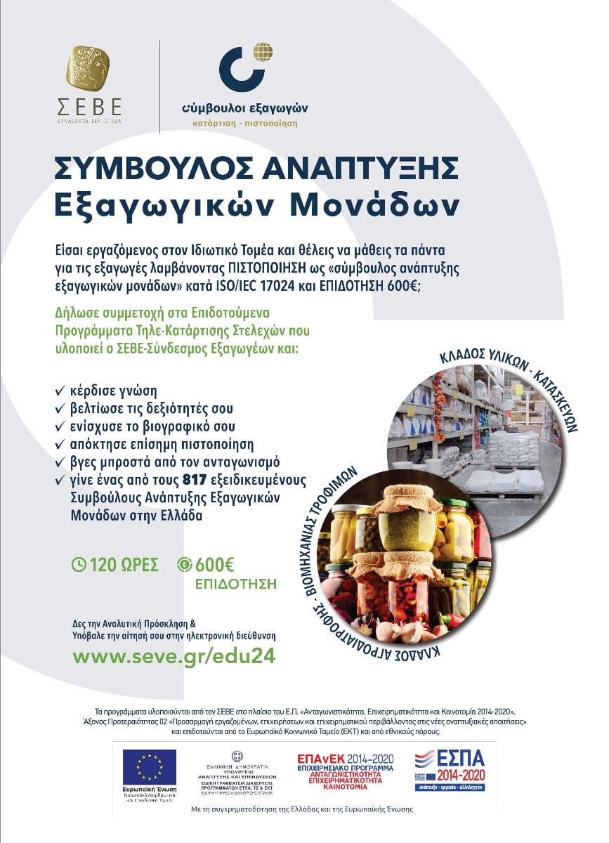 Τα προγράμματα, τα οποία υλοποιεί ο ΣΕΒΕ στο πλαίσιο του Ε.Π. «Ανταγωνιστικότητα, Επιχειρηματικότητα και Καινοτομία 2014-2020» και τα οποία χρηματοδοτούνται από ευρωπαϊκούς και εθνικούς πόρους, απευθύνονται σε απασχολούμενους στον Ιδιωτικό Τομέα της Οικονομίας. Ειδικότερα, ο πρώτος κύκλος κατάρτισης αφορά στον τομέα της Ανάπτυξης Εξαγωγικών Μονάδων στον κλάδο της Αγροδιατροφής – Βιομηχανίας Τροφίμων και ο δεύτερος στον τομέα της Ανάπτυξης Εξαγωγικών μονάδων στον κλάδο των Δομικών Υλικών.