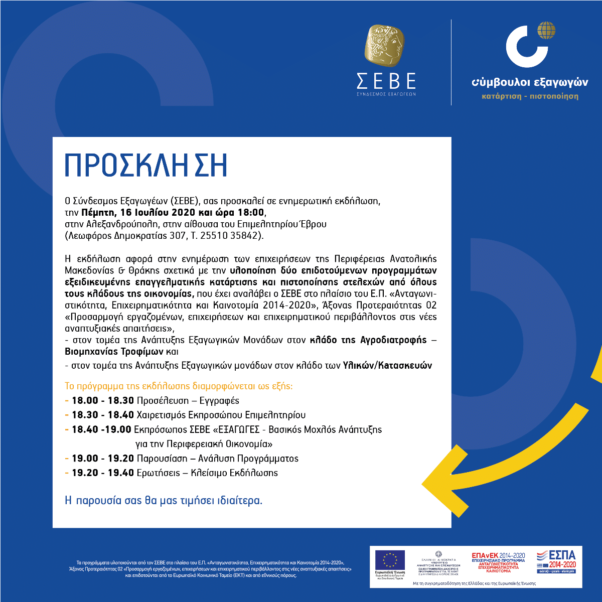Ενημερωτική εκδήλωση σχετικά με την υλοποίηση δύο νέων επιδοτούμενων προγραμμάτων επαγγελματικής εξειδίκευσης πραγματοποιεί ο ΣΕΒΕ, την Πέμπτη, 16 Ιουλίου 2020 και ώρα 18:00, στην Αλεξανδρούπολη, στην αίθουσα του Επιμελητηρίου Έβρου.