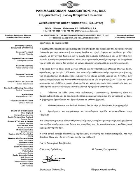 Σε γενικευμένο μποϋκοτάζ κατά της Τουρκίας, καλεί την Ομογενειακή Κοινότητα των Ηνωμένων Πολιτειών Αμερικής,η Παμμακεδονική Ένωση Αμερική, σε ένδειξη διαμαρτυρίας για την βεβήλωση του παγκόσμιου μνημείου της Ορθοδοξίας, την Αγία Σοφία.
