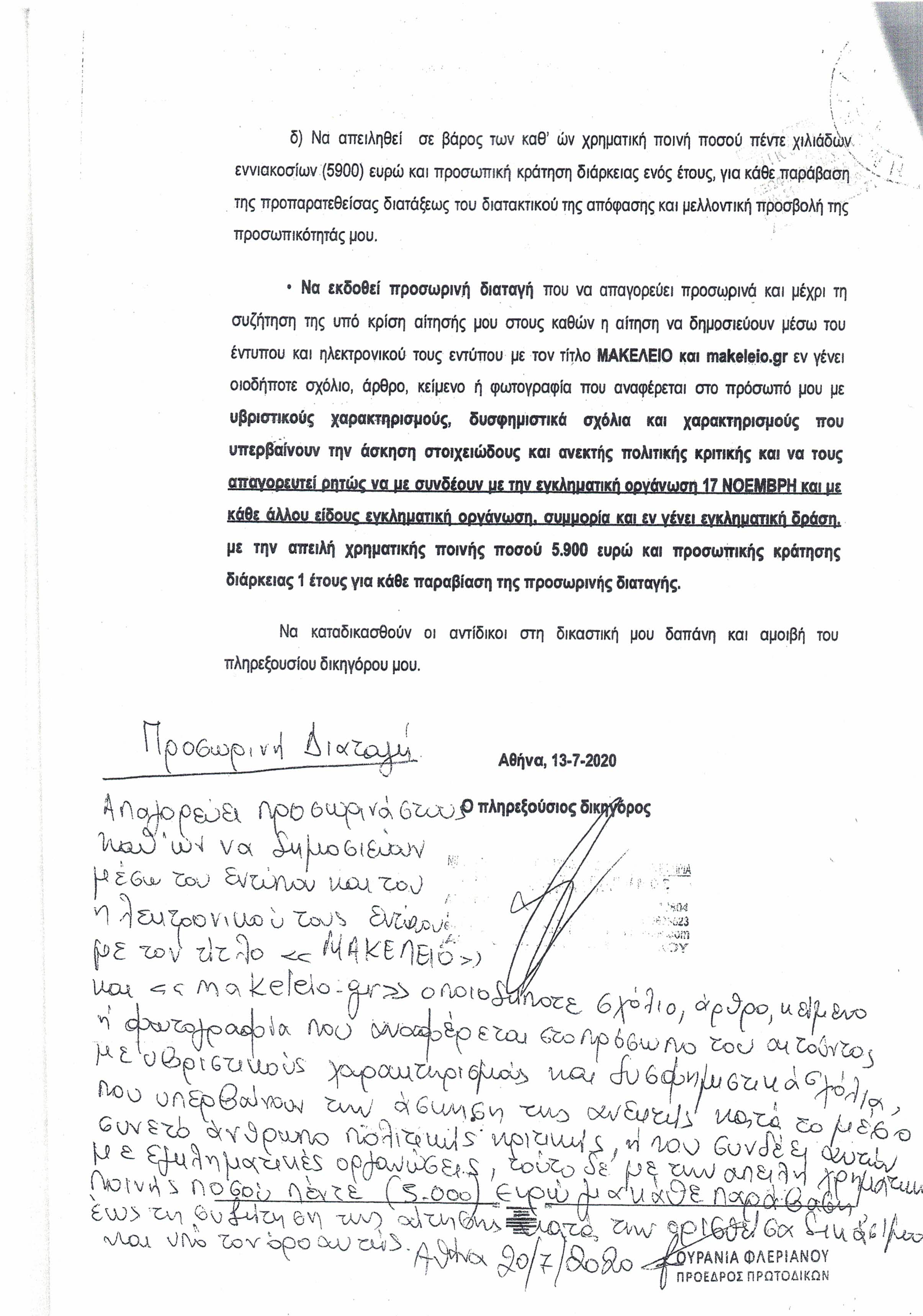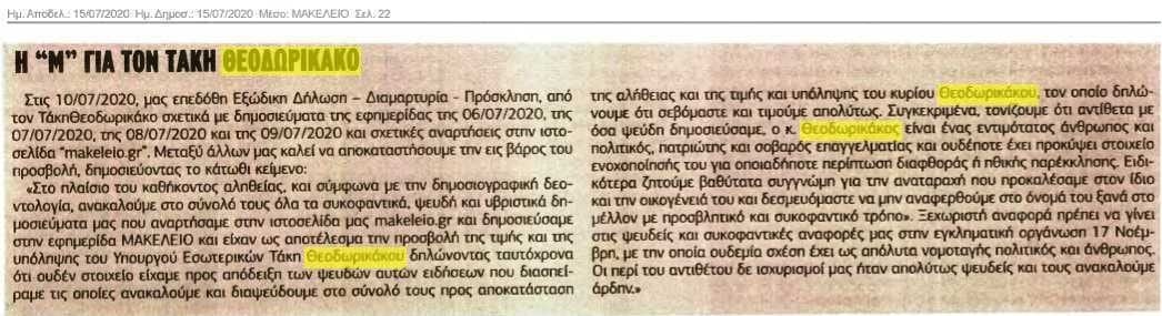 Στην πλήρη δικαίωση του υπουργού Εσωτερικών κ. Θεοδωρικάκου προχώρησε η Πρόεδρος Πρωτοδικών Αθηνών, η κ. Ουρανία Φλεριάνου, η οποία με προσωρινή διαταγή – «κόλαφο» για την εφημερίδα «Μακελειό» απαγορεύει κάθε υβριστική, απαξιωτική, προσβλητική ή συκοφαντική αναφορά, σε οποιαδήποτε μορφή (σχόλιο, άρθρο, κείμενο, φωτογραφία), εις βάρος του.