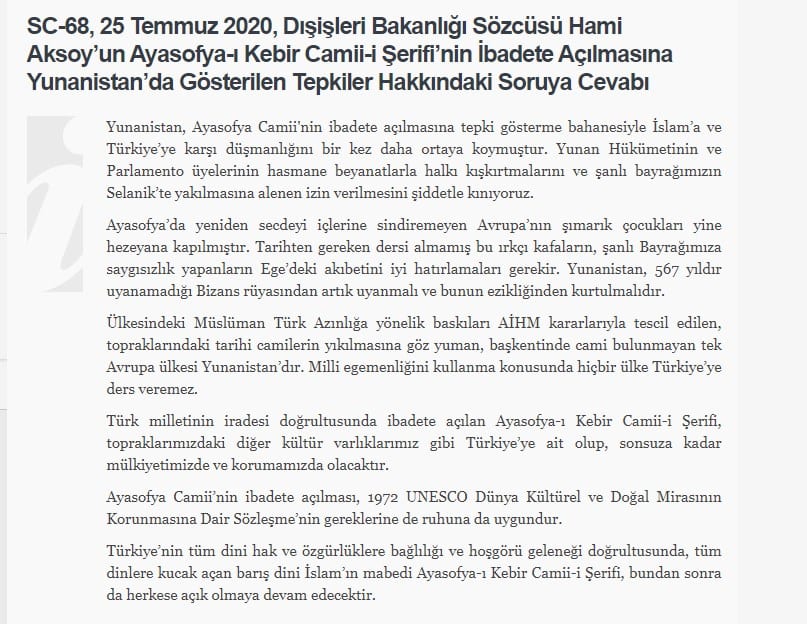 «Η Τουρκία δεν μπορεί να δώσει μαθήματα σχετικά με τον τρόπο χρήσης της εθνικής κυριαρχίας οποιασδήποτε χώρας. Η Τουρκία άνοιξε για λατρεία σύμφωνα με τη βούληση του τουρκικού έθνους το τζαμί της Αγίας Σοφίας, όπως τα άλλα πολιτιστικά μας περιουσιακά στοιχεία της γης μας, ανήκουν στην Τουρκία, θα είναι για πάντα στην ιδιοκτησία και στην προστασία μας. Το άνοιγμα του τζαμιού της Αγίας Σοφίας για λατρεία είναι σύμφωνο με τις απαιτήσεις της Σύμβασης για τη διατήρηση της πολιτιστικής και φυσικής κληρονομιάς της UNESCO του 1972» καταλήγει.