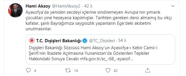 «Τα κακομαθημένα παιδιά της Ευρώπης δεν μπορούν να χωνέψουν ότι γίνεται ξανά προσκύνημα στην Αγία Σοφία και τρέφουν ξανά αυταπάτες. Αυτά τα ρατσιστικά κεφάλια δεν έχουν πάρει μάθημα από την ιστορία και ας θυμηθούν τι έπαθαν στο Αιγαίο όσοι δεν έδειξαν σεβασμό στην τουρκική σημαία» αναφέρει ο εκπρόσωπος του τουρκικού ΥΠΕΞ, Χαμί Ακσόι.