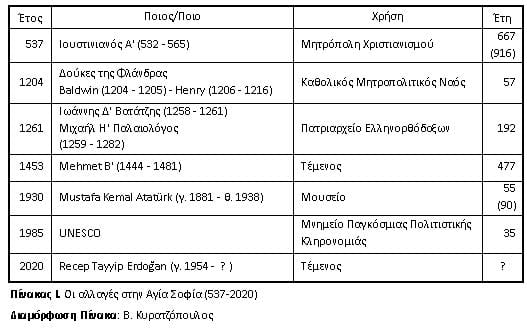 Όπως διαπιστώνεται από τον Πίνακα Ι, ο Ναός της Αγίας του Θεού Σοφίας έχει υποστεί αρκετές μεταβολές σε ότι αφορά τη χρήση του. Όμως όπως έχουν καταγράψει οι χρονογράφοι, τη μεγαλύτερη ζημιά και βανδαλισμούς έχει υποστεί, κατά την διάρκεια της Δ’ Σταυροφορίας από τους “Miles Christi” (Στρατός του Χριστού).