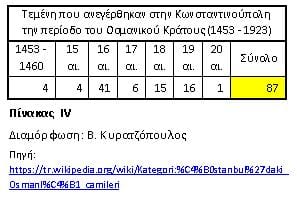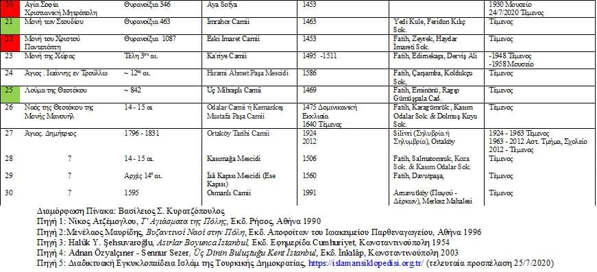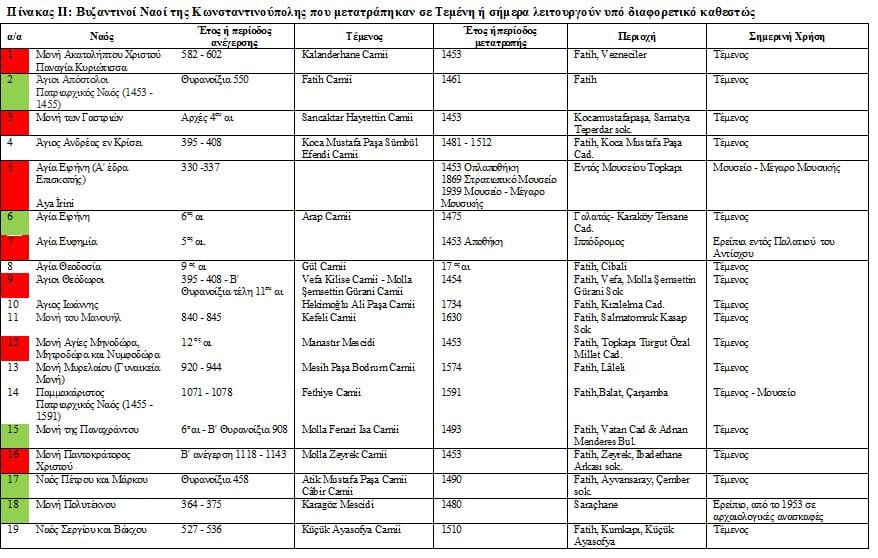 Ο Mehmed Β’ (1451-1481), προ των επιθέσεων είχε δηλώσει ότι όλα τα κτήρια της Κωνσταντινούπολης ως λάφυρα ανήκουν στο Σουλτάνο. Έτσι και ως επιβεβαίωση των κυριαρχικών του δικαιωμάτων επί των Βυζαντινών λαών, ως πρώτη πράξη θα μετατρέψει τη Μητρόπολη των Ελληνορθόδοξων σε Τέμενος. Όμως τι απέγιναν ως προς τον Raymond Janin οι πέρα των 400 [11] και ως προς τον Halûk Şeysuvaroğlu οι 1560 Μονές και Ναοί [12] ; Σήμερα “διασώζονται” μόνο 34. Εξ αυτών, οι 28 λειτουργούν ως λατρευτικοί χώροι του Ισλάμ [Κοίτα πίνακα ΙΙ] [13] , οι 4 ως Ελληνορθόδοξοι Ναοί και 2 βρίσκονται σε διαφορετικό καθεστώς.