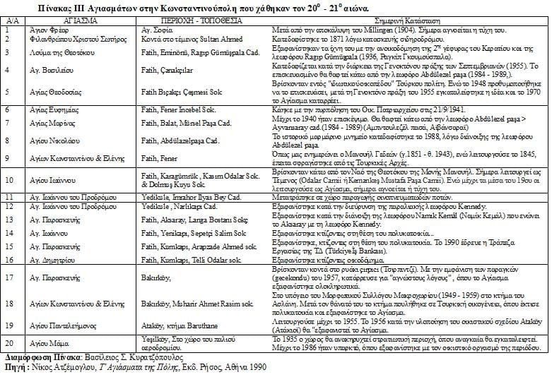 Σε μία πόλη που για αιώνες υπήρξε πρόβλημα λειψυδρίας, παρά την ύπαρξη των Στερνών του Ιουστινιανού, το νερό για τον Κωνσταντινουπολίτη ήταν ιερό για αιώνες. Η αδυναμία προστασίας ιερών χώρων θα περιορίσει τα εν λειτουργία Ελληνορθόδοξα Αγιάσματα στην Κωνσταντινούπολη. Έτσι από τα 595 ιστορικά καταγεγραμμένα Αγιάσματα [20] , σήμερα υπάρχουν μόνο τα 27 [Κοίτα Πίνακα VII] . Στο βωμό της οικοδομικής βιομηχανίας δεν υπήρξε κανένας σεβασμός στους ιερούς χώρους που διέθεταν πόσιμο ιερό νερό [ως μερικά παραδείγματα Κοίτα στον Πίνακα ΙΙΙ] . Κατόπιν μελέτης δημιουργείται η αίσθηση ότι στη σύγχρονη Κωνσταντινούπολη οι δρόμοι σχεδιάζονταν στοχεύοντας τα μη Μουσουλμανικά Ιδρύματα και Ιερούς χώρους…