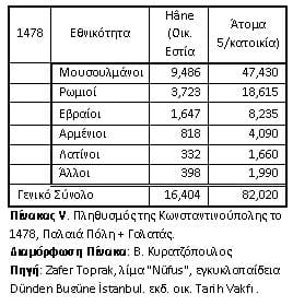 Όπως μας ενημερώνει ο Toprak [Κοίτα Πίνακα V] βάσει εγγράφου που βρέθηκε στα αρχεία του Topkapı, το 1478, σε Παλαιά Πόλη και Γαλατά, στις 16.404 οικογενειακές εστίες κατοικούσαν 82.020 άτομα (με αποδοχή ότι σε κάθε εστία κατά Μ.Ο. κατοικούσαν 5 άτομα) από τους οποίους οι 47.430 ήταν Μουσουλμάνοι. Δηλαδή η αντιστοιχία ήταν 1.977 άτομα ανά Τέμενος…