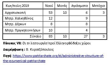Κατά την τέλεση της Γενοκτόνου πράξης των Σεπτεμβριανών [21] , θα πυρποληθούν 73 Ναοί και Μονές. Οι περισσότερες εξ αυτών θα αναστηλωθούν με ιδίες δυνάμεις της κοινότητας και τις πενιχρές ενισχύσεις της ΤΔ [22] , που δεν θα ξεπεράσουν το 12% των συνολικών ζημιών. Σήμερα στην Κωνσταντινούπολη λειτουργούν 83 Ναοί και 10 Μονές [Κοίτα Πίνακα VII] . Μερικές εξ αυτών έχουν παραχωρηθεί σε αλλοεθνείς Ρωμιούς για λειτουργικές ανάγκες. Στα επίσημα έγραφα των καταστροφών αναφέρονται μόνο 8 Αγιάσματα, αριθμός ελάχιστος ως προς την πραγματική καταστροφή που υπέστησαν.