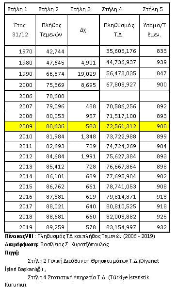 Με μία προσεκτική ματιά στους Πίνακες VIII και VI, θα διαπιστώσουμε ότι καθ’ όλη τη διάρκεια ζωής της ΤΔ (1923 και μετά) η κρατική μηχανή σε συνεργασία με τη Διεύθυνση Θρησκευμάτων προσπάθησε να διατηρήσει την αναλογία ένα τέμενος ανά 900 άτομα. Η ανέγερση Τεμενών θα εκτοξευθεί σε δύο κρίσιμες περιόδους (1981-1983) και (2010-2012), κατά τις οποίες άλλαζε το πολιτικό κατεστημένο. Στην πρώτη με το κίνημα Εβρέν ξεκινούσε η επικράτηση των Ισλαμιστών, και στη δεύτερη μετά το επεισόδιο Mavi Marmara [23] , ξεκινούσε η διάσπαση των Ισλαμιστών του Muhammed Fethullah Gülen με τον RTE. Τότε το “όπιο του λαού” λειτούργησε θετικά για τον RTE σ’ ότι αφορά τα εσωτερικά της ΤΔ, όμως ο μέσος Δυτικός πολίτης δεν ενημερώθηκε από τα συστημικά ΜΜΕ για τις επερχόμενες αλλαγές. Γιατί;