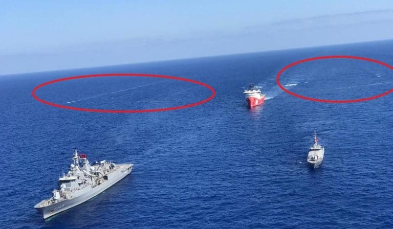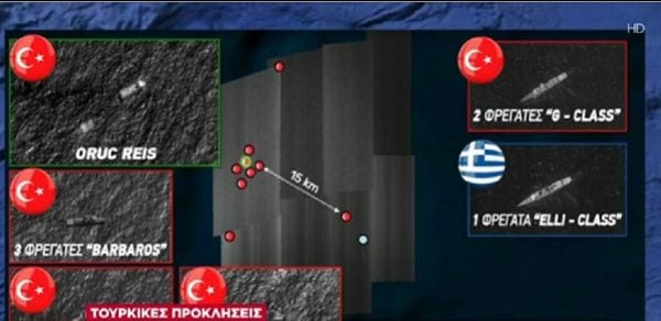Στη φωτογραφία αποτυπώνεται η κατάσταση στην θαλάσσια περιοχή που έχει δεσμεύσει παράνομα η τουρκική Navtex. Σε αυτή, όπως παρουσιάστηκε στον τηλεοπτικό σταθμό ΣΚΑΙ, φαίνεται το τουρκικό ερευνητικό με απλωμένα καλώδια να συνοδεύεται από δύο ρυμουλκά αλλά και τρεις φρεγάτες κλάσης «Barbaros», δύο κορβέτες κλάσης «Burak» και δύο φρεγάτες G-CLASS του Τουρκικού Ναυτικού.