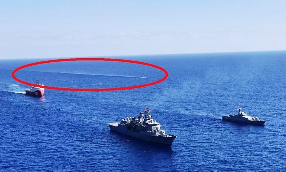 Είναι πέρα για πέρα αδιαμφισβήτητο ότι το Oruc Reis πραγματοποίησε και συνεχίζει έρευνες εντός της ελληνικής υφαλοκρηπίδας. Στη δορυφορική φωτογραφία-ντοκουμέντο από ισραηλινό δορυφόρο φαίνεται καθαρά το μηχάνημα που σέρνει πίσω του, κάτω από την επιφάνεια της θάλασσας το τουρκικό ερευνητικό σκάφος.