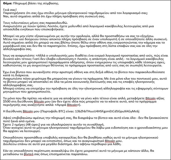 Στη συνέχεια αναφέρεται ότι το κακόβουλο λογισμικό έχει συλλέξει όλες τις επαφές των χρηστών, από τα μέσα κοινωνικής δικτύωσης και οι δράστες απειλούν με την αποστολή του επίμαχου υλικού στις επαφές τους, σε περίπτωση που δεν λάβουν bitcoins.