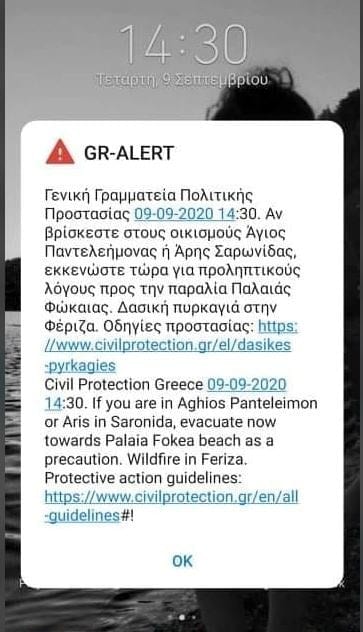 Προειδοποίηση και εντολή να εκκενώσουν τους οικισμούς «Άγιος Παντελεήμονας» και «Άρης Σαρωνίδας» εξέδωσε η Γενική Γραμματεία Πολιτικής Προστασίας μέσω του 112. Σε μήνυμα που εστάλη σε κατοίκους, η Γενική Γραμματεία τούς καλεί να εκκενώσουν τους παραπάνω οικισμούς για προληπτικούς λόγους και να κατευθυνθούν προς την παραλία Παλαιάς Φώκαιας.