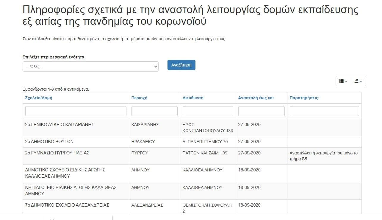 Αυτή τη στιγμή στη χώρα είναι κλειστά πέντε σχολεία και ένα τμήμα σχολείου. Συγκεκριμένα, σύμφωνα με σημερινά στοιχεία του υπουργείου Παιδείας που αφορούν στην αναστολή λειτουργίας δομών εκπαίδευσης εξαιτίας της πανδημίας, είναι κλειστά τα εξής σχολεία:
