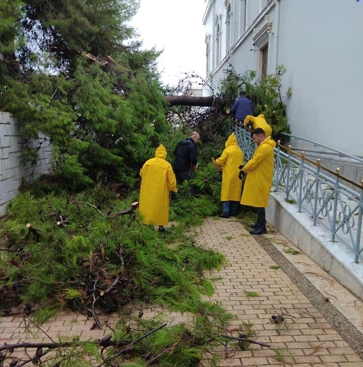Πτώση δένδρων στην κεντρική πλατεία του Πύργου, δίπλα στον Ιερό Ναό του Αγίου Νικολάου.