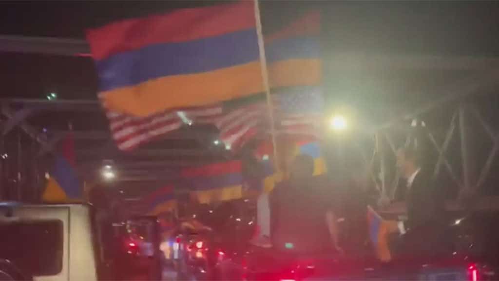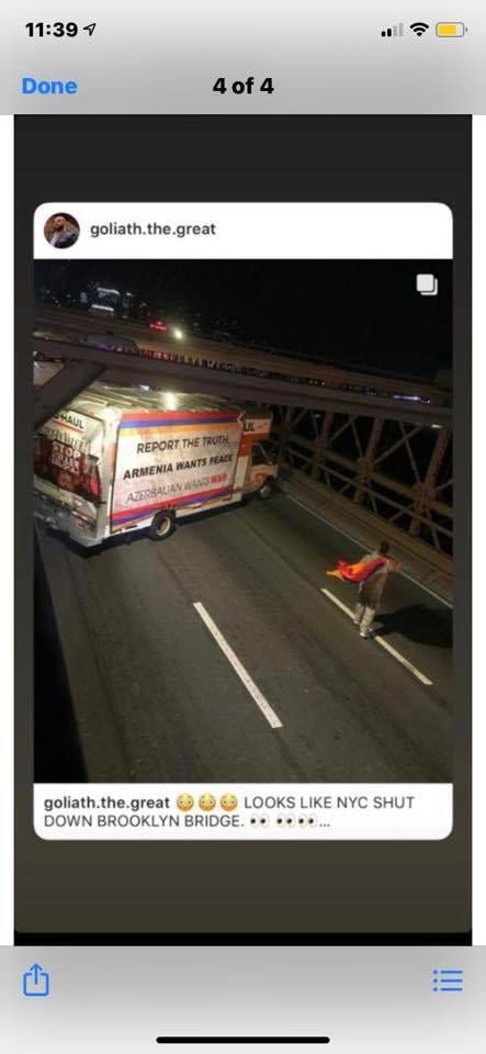 Μετά το μεγαλειώδες συλλαλητήριο στο Μανχάταν, όπου χιλιάδες Αρμένιοι και Έλληνες βροντοφώναξαν ότι το Αρτσάχ είναι Αρμενικό, σε μια εντυπωσιακή κίνηση , όπως μας μεταδίδει ο δημοσιογράφος του HELLAS FM Δημήτρης Φιλιππίδης, μέλη της Αρμενικής κοινότητας απέκλεισαν μια από της κεντρικές γέφυρες της Νέας Υόρκης στο Μπρούκλιν, με οχήματα που είχαν μηνύματα, δημιουργώντας κυκλοφοριακό κομφούζιο.