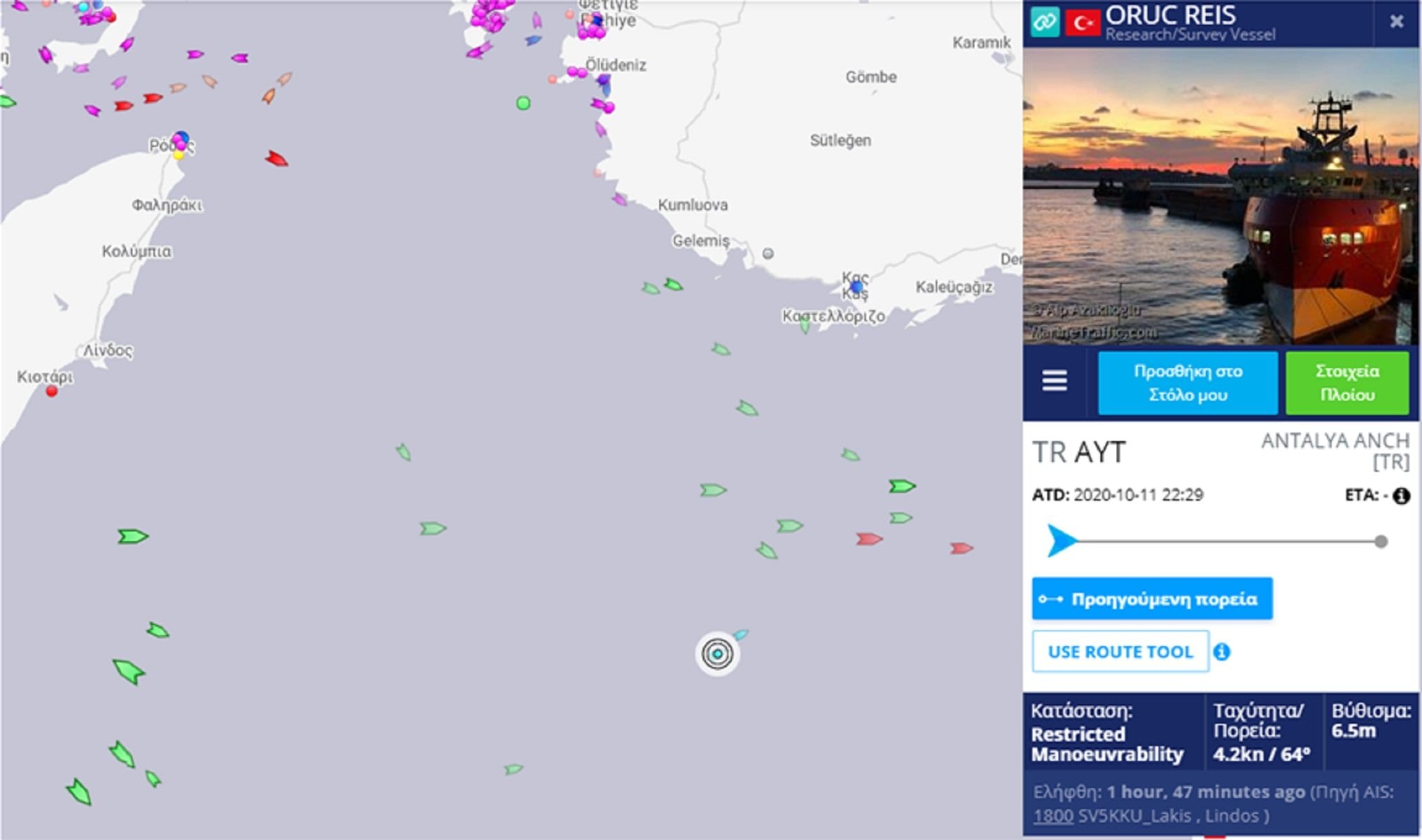Με κλειστό το σύστημα γεωγραφικού προσδιορισμού πλέει το Oruc Reis. Το τουρκικό σεισμογραφικό σκάφος φαίνεται πως έκλεισε το σύστημά του λίγο μετά τις 10:00 το πρωί της Τρίτης 13 Οκτωβρίου. Το τελευταίο στίγμα του εντοπίζεται σε περιοχή ελληνικής υφαλοκρηπίδας, περί τα 35 ναυτικά μίλια νοτίως του Καστελόριζου.