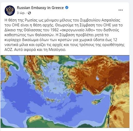 Παρέμβαση την ρωσικής πρεσβείας στην Αθήνα που αντικατοπτρίζει την επίσημη θέση του Κρεμλίνου και θεωρεί ως «ακρογωνιαίο λίθο» του διεθνούς καθεστώτος των θαλασσών τη Σύμβαση του ΟΗΕ για το Δίκαιο της θάλασσας του 1982, σύμφωνα με την οποία προβλέπεται ρητά το κυρίαρχο δικαίωμα όλων των κρατών για χωρικά ύδατα έως 12 ναυτικά μίλια.