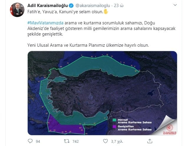 «Χαιρετίσματα στα Φατίχ, Γαβούζ και Κανουνί. Επεκτείναμε την περιοχή ευθύνης αναζήτησης και διάσωσης στην Γαλάζια Πατρίδα μας για να συμπεριλάβουμε τις περιοχές αναζήτησης των εθνικών μας πλοίων που λειτουργούν στην Ανατολική Μεσόγειο. Καλή τύχη στη χώρα μας στο νέο Εθνικό Σχέδιο Έρευνας και Διάσωσης» γράφει στην ανάρτησή του στο Twitter ο ανεκδιήγητος Τούρκος υπουργός, δημοσιεύοντας και τον χάρτη, ακολουθώντας πιστά την πολιτική της αμφισβήτησης των κυριαρχικών δικαιωμάτων της Ελλάδας.