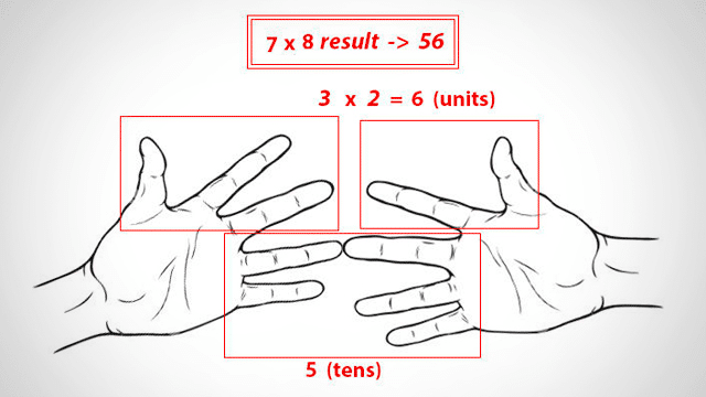 -Προσθέστε τους αριθμούς των δύο δαχτύλων που ενώσατε και των παρακάτω. Στο παράδειγμα αυτό είναι 5 δάχτυλα. Αυτός ο αριθμός θα είναι ο πρώτος στην απάντηση σας (ο αριθμός αυτός αντιστοιχεί στην δεκάδα, άρα 5 = 50).