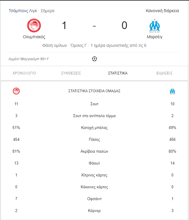 Ο Ολυμπιακός άνοιξε στις καθυστερήσεις του αγώνα με τη Μαρσέιγ το σκορ πετυχαίνοντας παράλληλα και τη νίκη με 1-0.