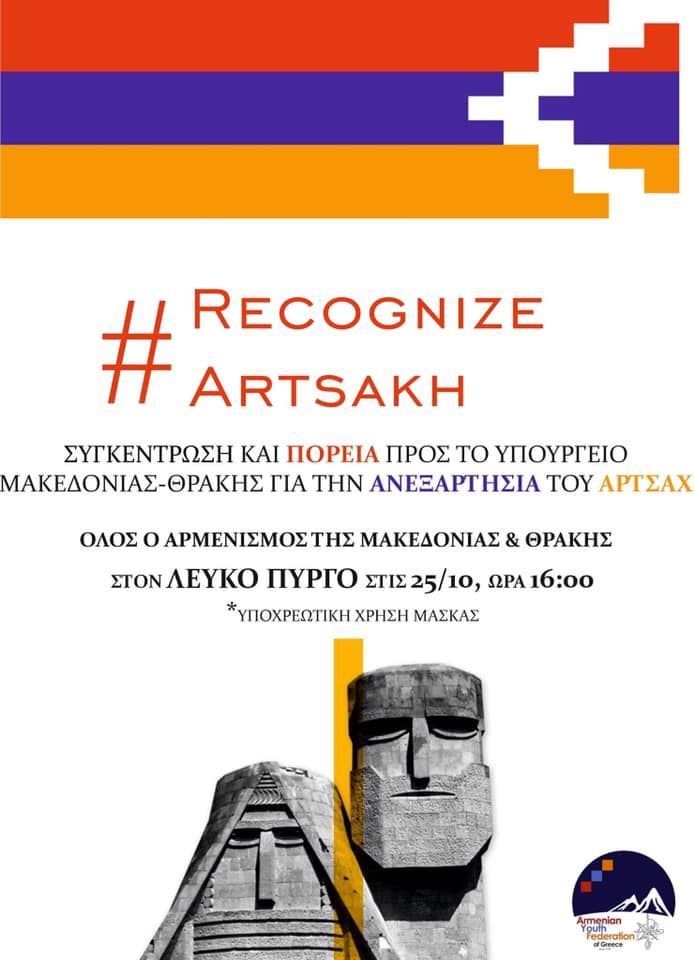 Συγκέντρωση και πορεία προς το Υπουργείο Μακεδονίας και Θράκης για την αναγνώριση της ανεξαρτησίας του Αρτσάχ, διοργανώνει η Αρμενική Κοινότητα την Κυριακή 25/10 ώρα 4:00μ.μ. ,στον Λευκό Πύργο. Η Αρμενία υφίσταται για μια ακόμη φορά την εγκληματική πολιτική της Τουρκίας, που καθοδηγεί τον εγκληματία Αλίεφ και το Αζερμπαϊτζάν στην εισβολή σε αρμενικά εδάφη πραγματοποιώντας μια σειρά από εγκλήματα κατά αμάχων.