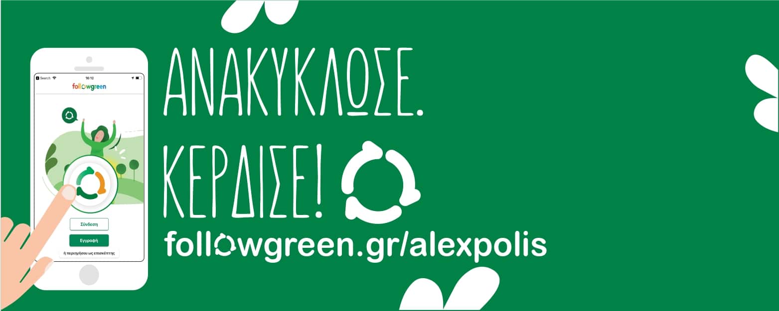 Ο Δήμος Αλεξανδρούπολης, ακολουθώντας τις νέες ανάγκες της εποχής για ψηφιοποίηση των υπηρεσιών, προχώρησε στις 23/10/2020 στη δημιουργία της διαδικτυακής πλατφόρμας επιβράβευσης της ανακύκλωσης Followgreen.gr/alexpolis.