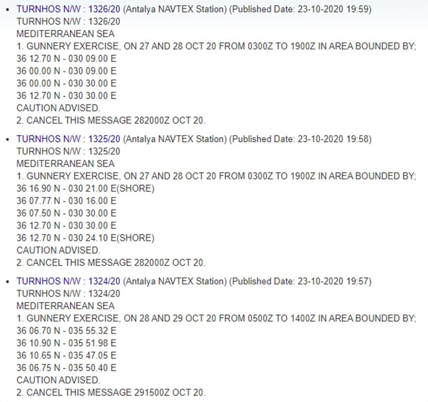 Συγκεκριμένα, το βράδυ της Παρασκευής, η Τουρκία εξέδωσε τρεις νέες NAVTEV για στρατιωτικές ασκήσεις το χρονικό διάστημα από 27 έως 29 Οκτωβρίου.