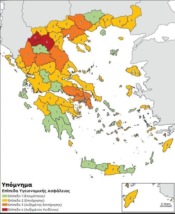 – Παράλληλα οι Περιφερειακές Ενότητες Αχαΐας, Ηρακλείου Κρήτης, Καρδίτσας, Μυτιλήνης, Μυκόνου, Πέλλας και Σάμου, που ήταν στο επίπεδο 3, δηλαδή στο πορτοκαλί, κατεβαίνουν βαθμό συναγερμού και περνούν στο επίπεδο 2, δηλαδή στο κίτρινο.