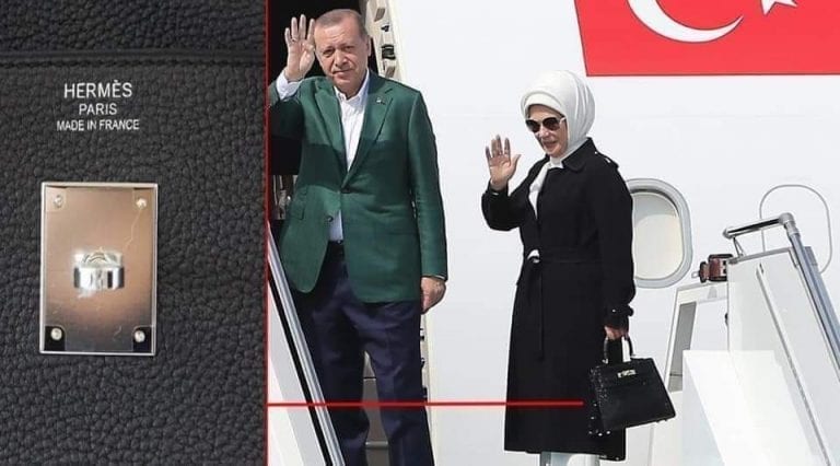 Σάλος στα social media από την επιλογή της Εμινέ Ερντογάν να εμφανιστεί κρατώντας μια πολυτελή και πανάκριβη γαλλική τσάντα HERMES , αξίας 50.000 ευρώ μετά το κάλεσμα του συζύγου της για μποϊκοτάζ στα γαλλικά προϊόντα.