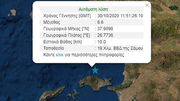 Σύμφωνα με την προκαταρκτική εκτίμηση του Γεωδυναμικού Ινστιτούτου Αθηνών, ισχυρότατη σεισμική δόνηση εντάσεως 6,7 Ρίχτερ ( νεότερη εκτίμηση) που έγινε αισθητή σε όλη τη χώρα, έχει επίκεντρο 19 χιλιόμετρα ΒΔ της Σάμου, με εστιακό βάθος μόλις στα 2 χιλιόμετρα. Νεότερη εκτίμηση του Ευρωμεσογειακού Ινστιτούτου κάνει εκτίμηση για μέγεθος 6,9 της κλίμακας Ρίχτερ.