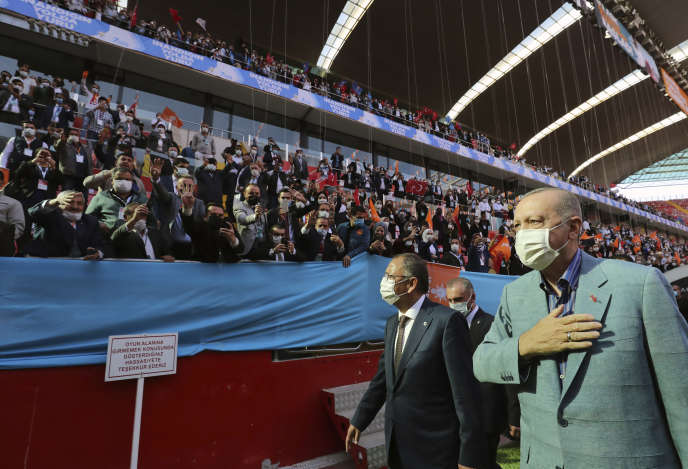 Ο Πρόεδρος Ερντογάν, στα δεξιά, κατά τη διάρκεια συνάντησης του κόμματός του στις 24 Οκτωβρίου στο Καϊσέρι, όπου επιτέθηκε βίαια στον Γάλλο ομόλογό του (Τουρκική Προεδρία μέσω AP)