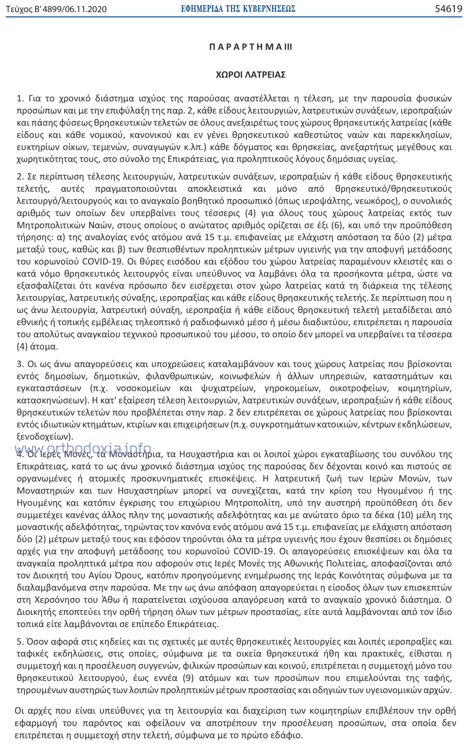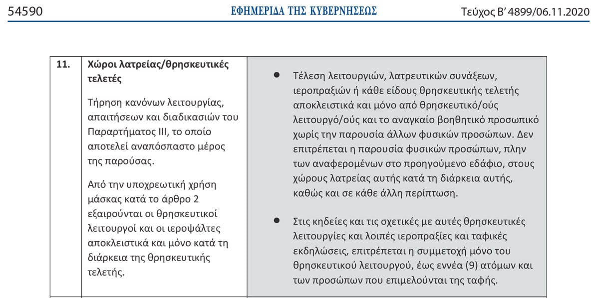Ουσιαστικά στους ναούς θα εισέρχονται μόνο οι κληρικοί και τα απαραίτητα πρόσωπα για να τελούνται οι κεκλεισμένων θυρών ακολουθίες, ενώ οι μόνες στιγμές κατά τις οποίες θα επιτρέπεται είσοδος πιστών στους ναούς (μέχρι 9 άτομα) είναι στις κηδείες.