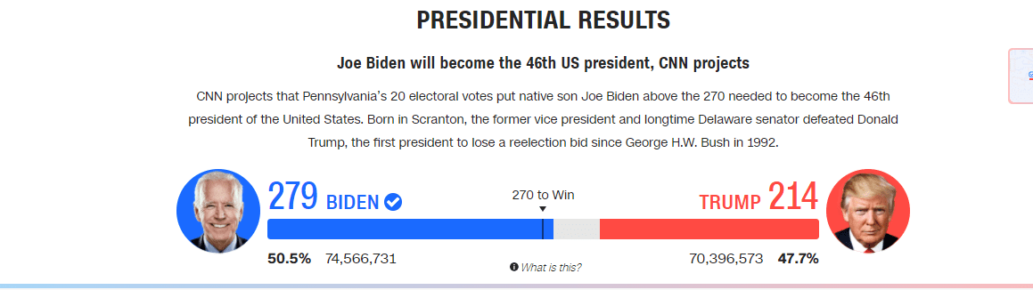 Σύμφωνα με τα αποτελέσματα που δίνονται ο Τζο Μπάιντεν έχει ποσοστό 50,5% και 74,5 εκατ ψήφους, ενώ ο Ντόναλντ Τραμπ έχει ποσοστό 47,7% και 70,4 εκατ. ψήφους. Οι Δημοκρατικοί εξασφάλισαν 279 εκλέκτορες και οι Ρεπουμπλικάνοι 214 εκλέκτορες.