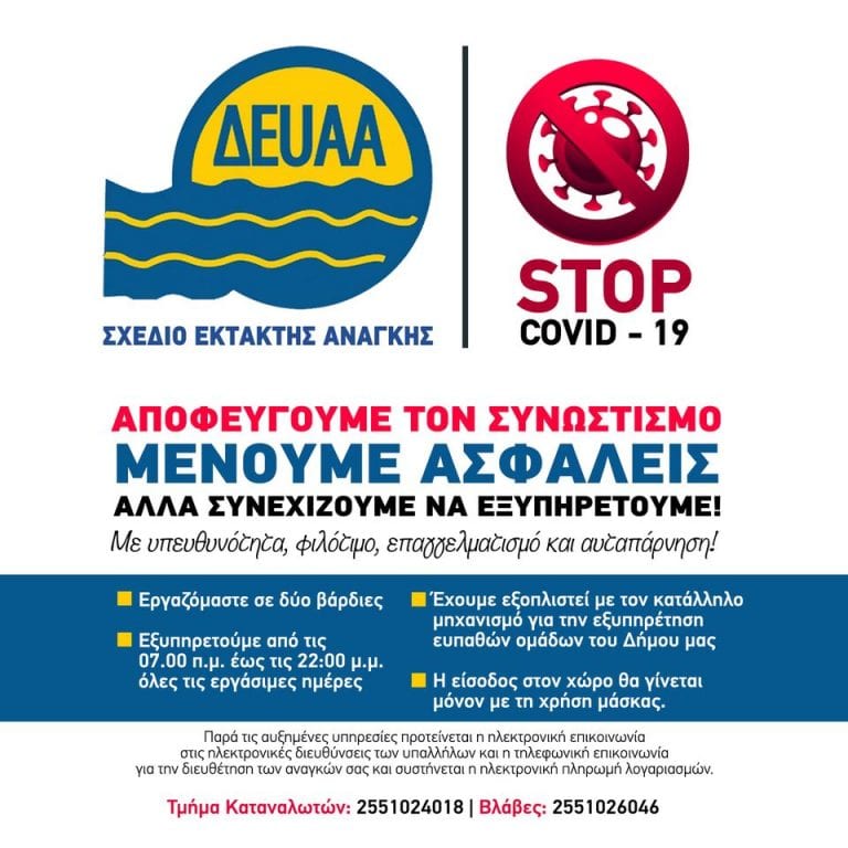 Η είσοδος στους χώρους της Δ.Ε.Υ.Α.Α. θα γίνεται μόνον με τη χρήση μάσκας.