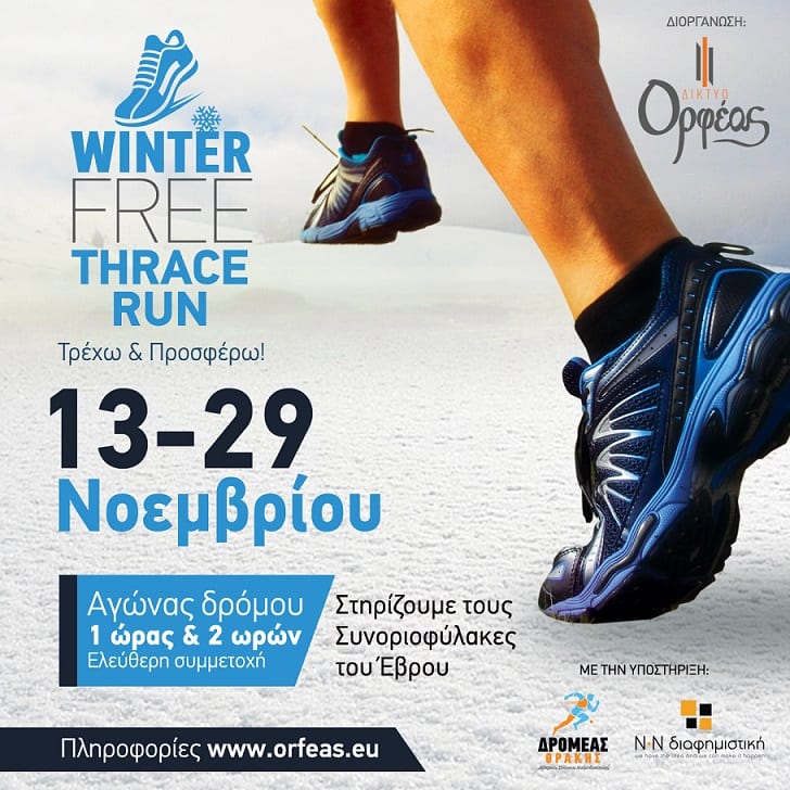 Μετά από την πολύ επιτυχημένη διοργάνωση του FREE THRACE RUN την Άνοιξη, με την τεράστια Πανελλαδική απήχηση, μια ακόμη όμορφη διέξοδο στην ανάγκη συμμετοχής σε έναν αγώνα δρόμου αντοχής και παράλληλα κοινωνικής συμμετοχής, έρχεται να δώσει το WINTER FREE THRACE RUN, που διοργανώνει το ΔΙΚΤΥΟ ΟΡΦΕΑΣ σε συνεργασία με το ΔΡΟΜΕΑ ΘΡΑΚΗΣ και την ΝΝ Διαφημιστική.